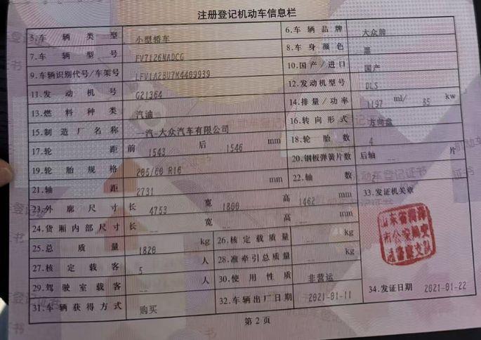 初次登记日期 2021-01-11 车辆名称 大众 速腾