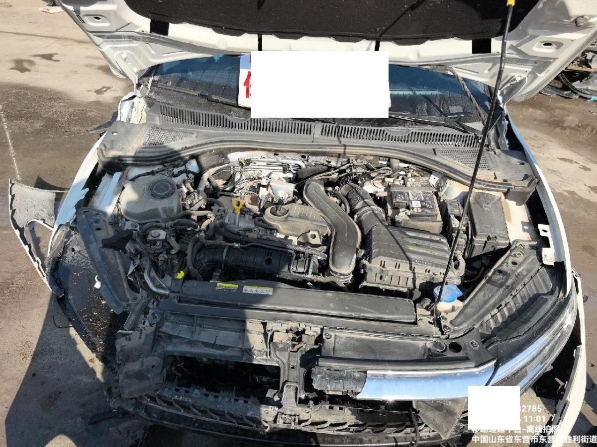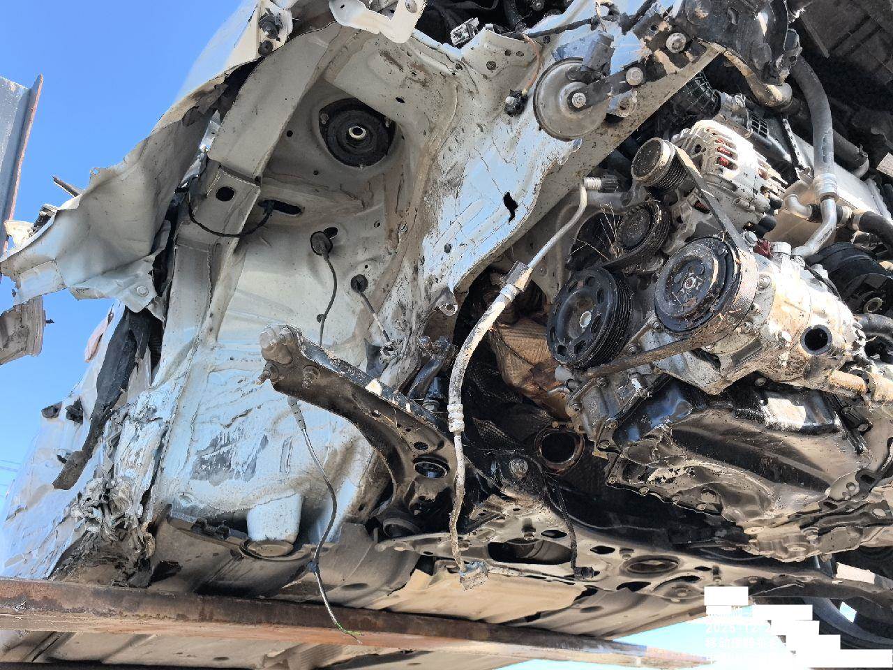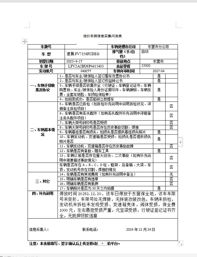 该车车架号未变形,车架号处无焊接,无拼装改装改色,车辆未拆检,发动机未拆检未发现受损、变速箱壳体,阀体受损,该车于2025年4月16日停放于东营保全地,残值拍卖完成后收取固定停车费,5天以内提车不额外收取停车费。超5天未提车,按实际停放天数*每天收取停车费。左右悬挂受损严重,元宝梁受损,行驶证登记证书齐全,无抵押贷款违章,铭牌挤压无法拍照