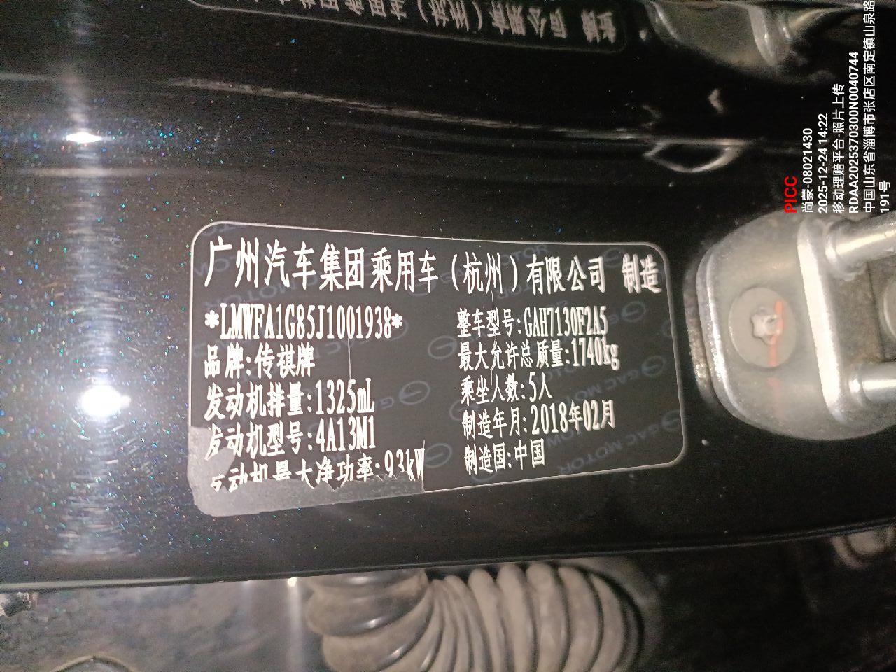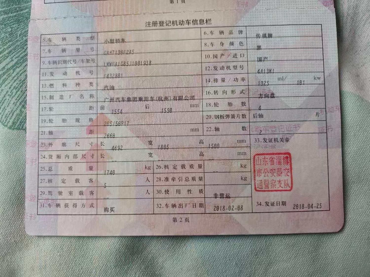 初次登记日期 2018-04-25 车辆名称 广汽传祺 传祺GA4