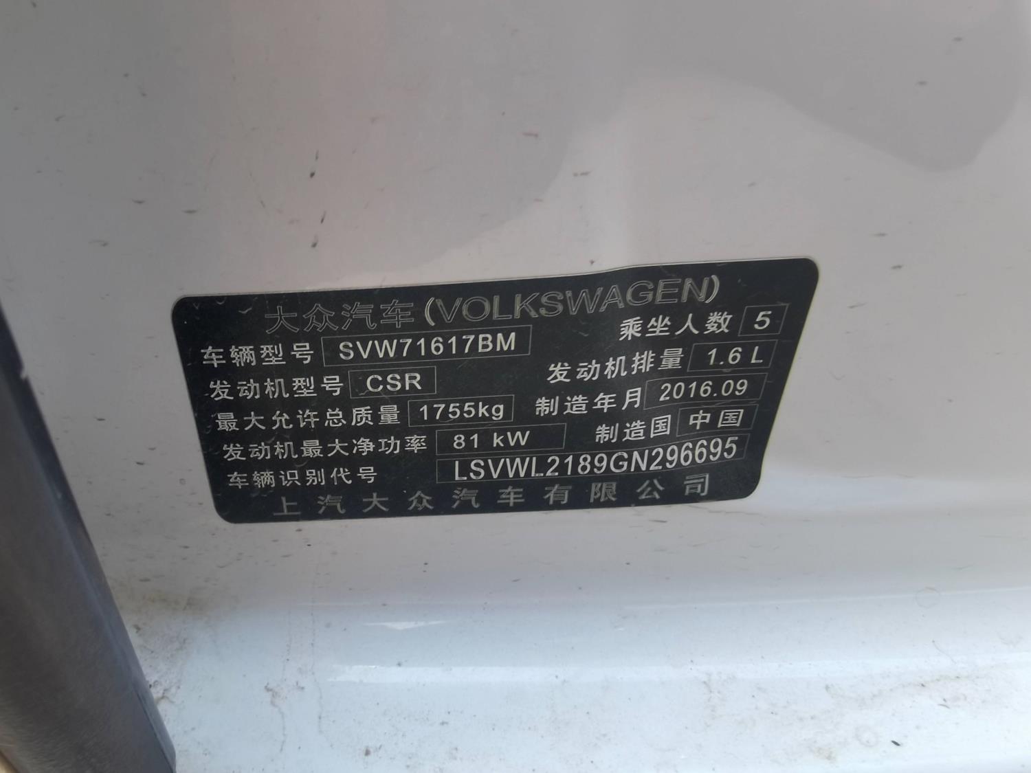 底盘号码 LSVWL2189GN296695 变速箱类型 手自一体