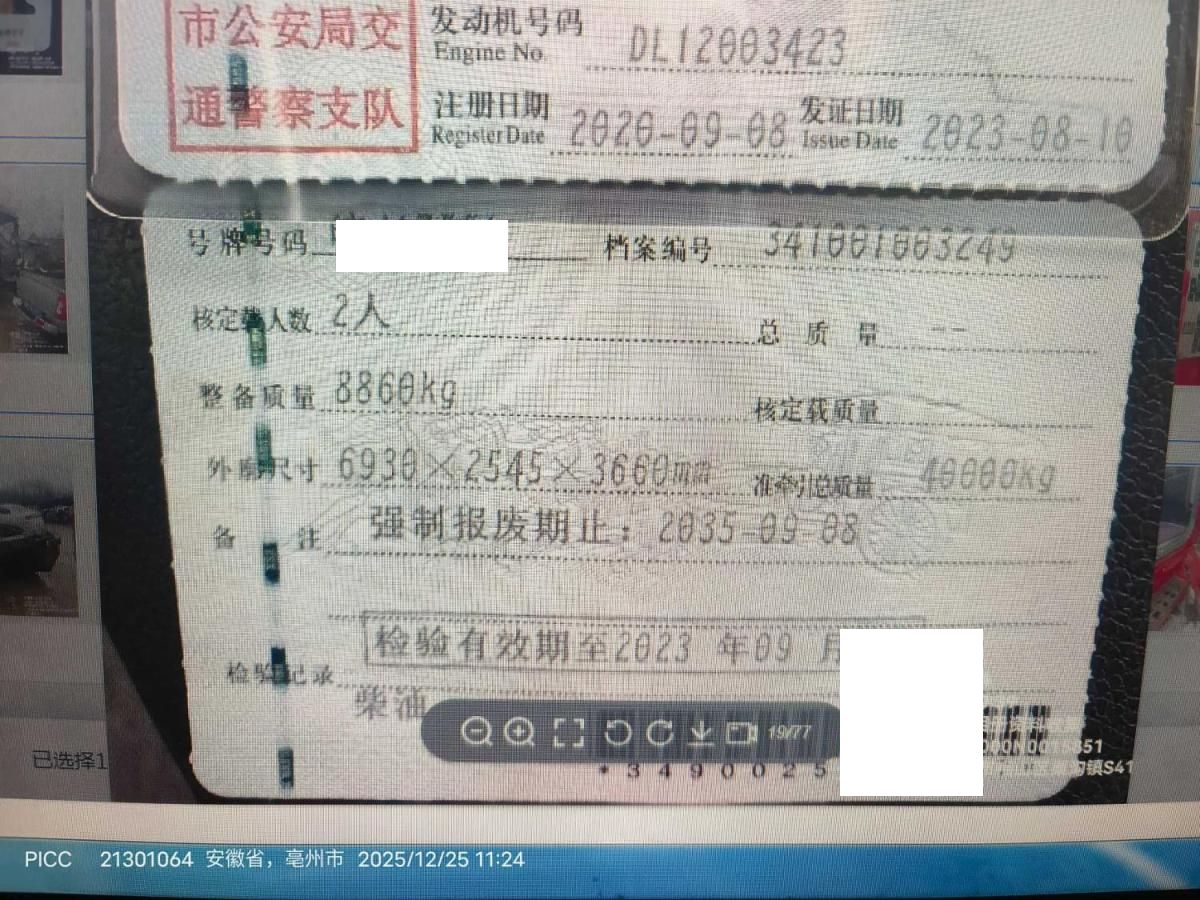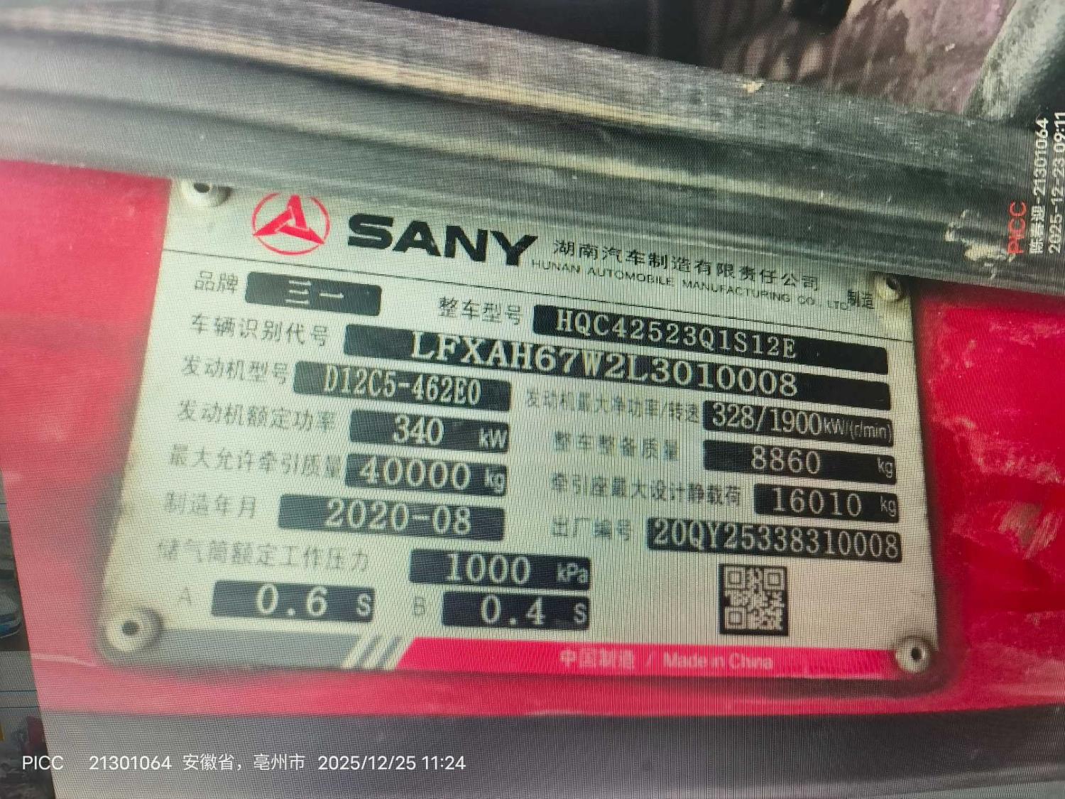 初次登记日期 2020-09-08 车辆名称 三一重卡