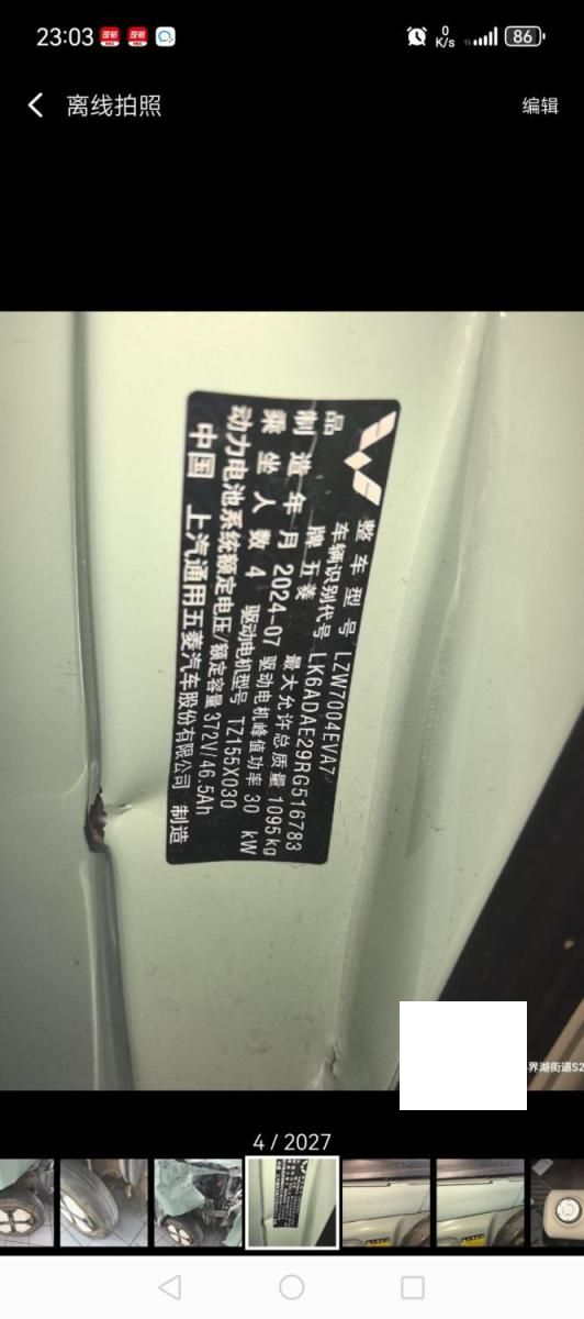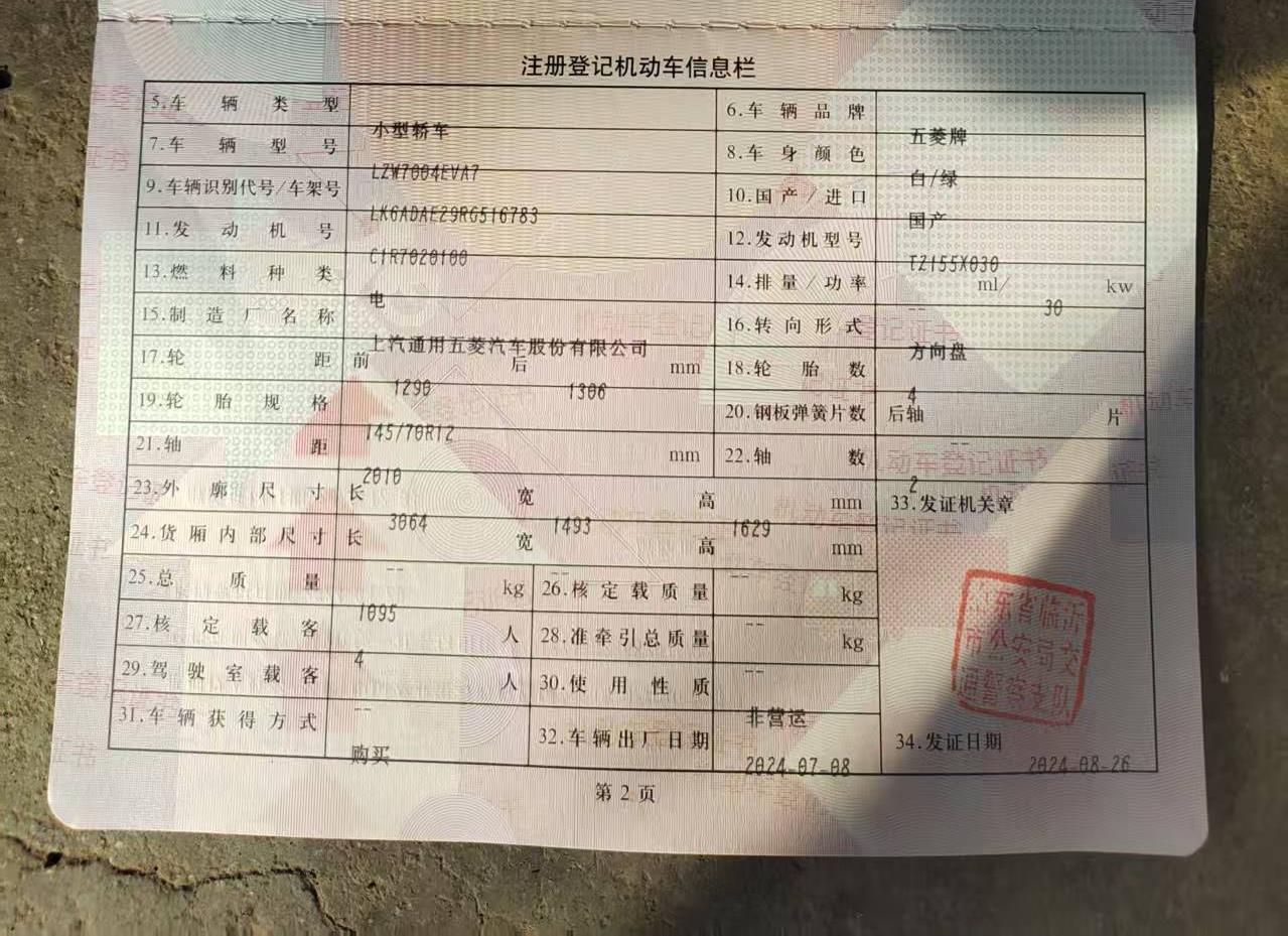 初次登记日期 2024-08-26 车辆名称 五菱汽车 宏光MINIEV