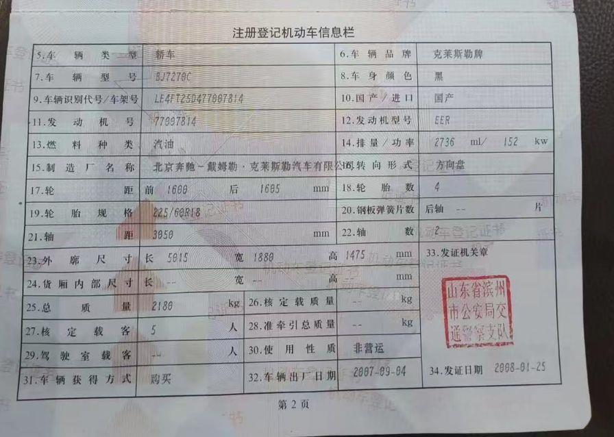 初次登记日期 2008-01-25 车辆名称 克莱斯勒300C