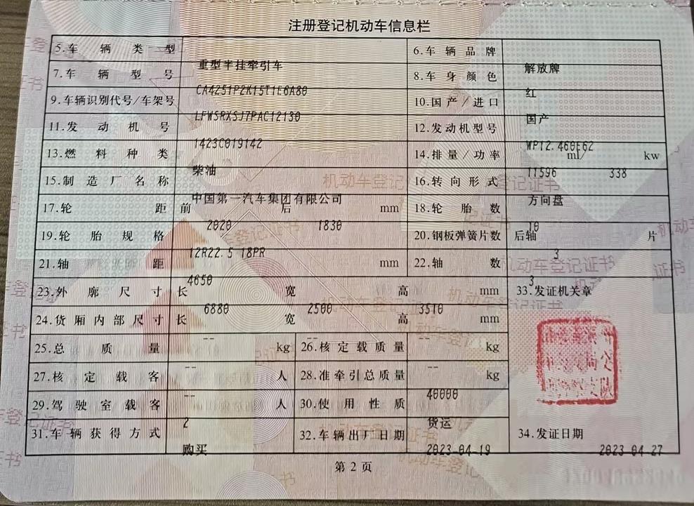 初次登记日期 2023-04-27 车辆名称 青岛解放 JH5