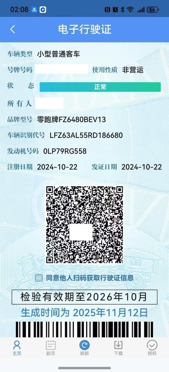 初次登记日期 2024-10-22 车辆名称 零跑汽车 零跑