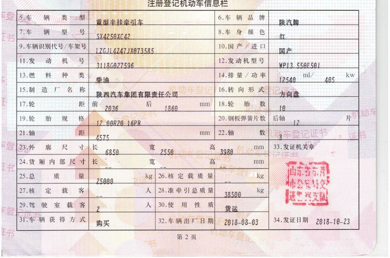 初次登记日期 2018-08-23 车辆名称 陕汽 德龙