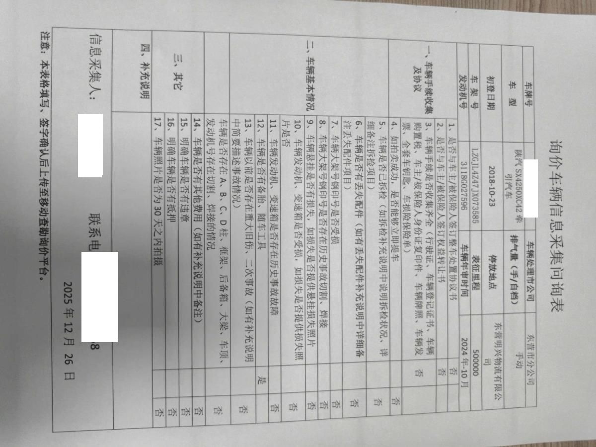车架号是否受损 未知 使用性质 货运