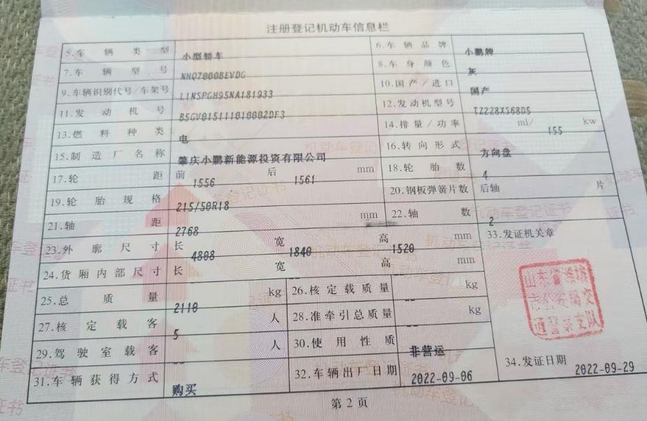 初次登记日期 2022-09-29 车辆名称 小鹏P5
