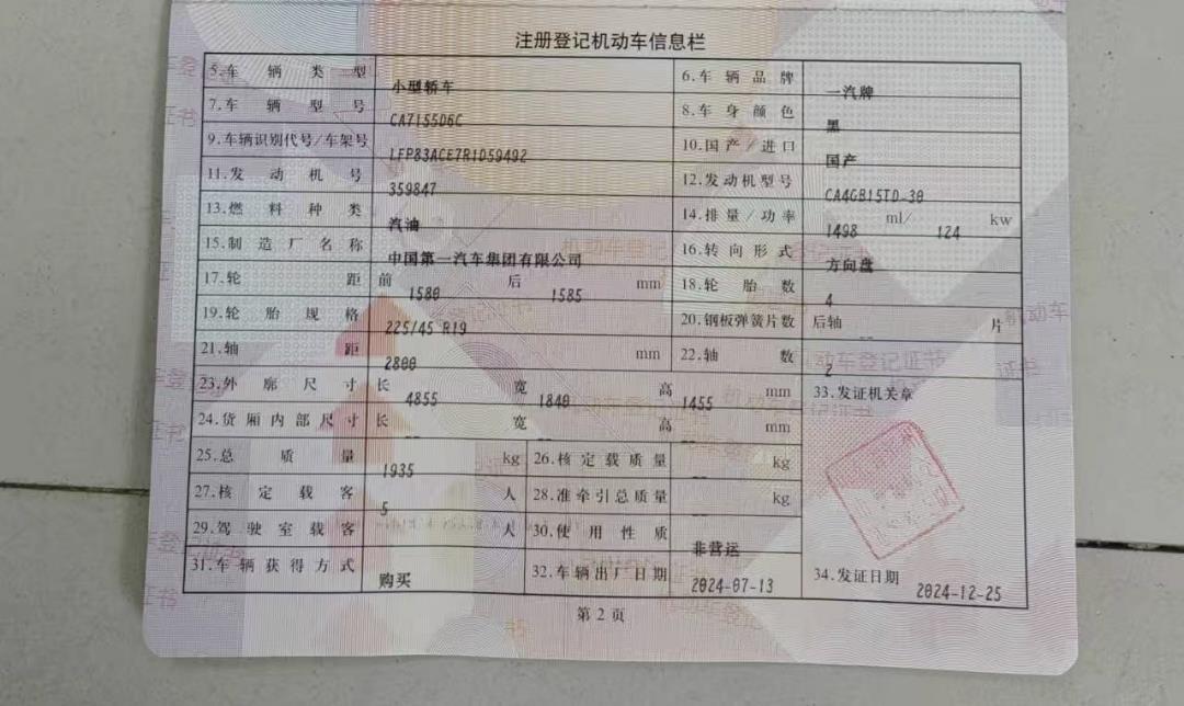 初次登记日期 2024-12-25 车辆名称 奔腾牌
