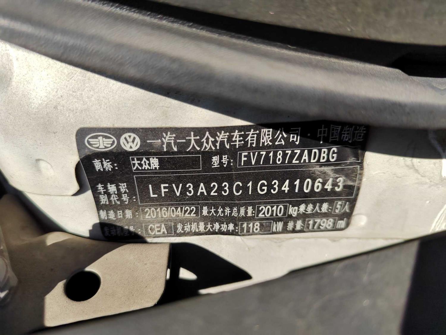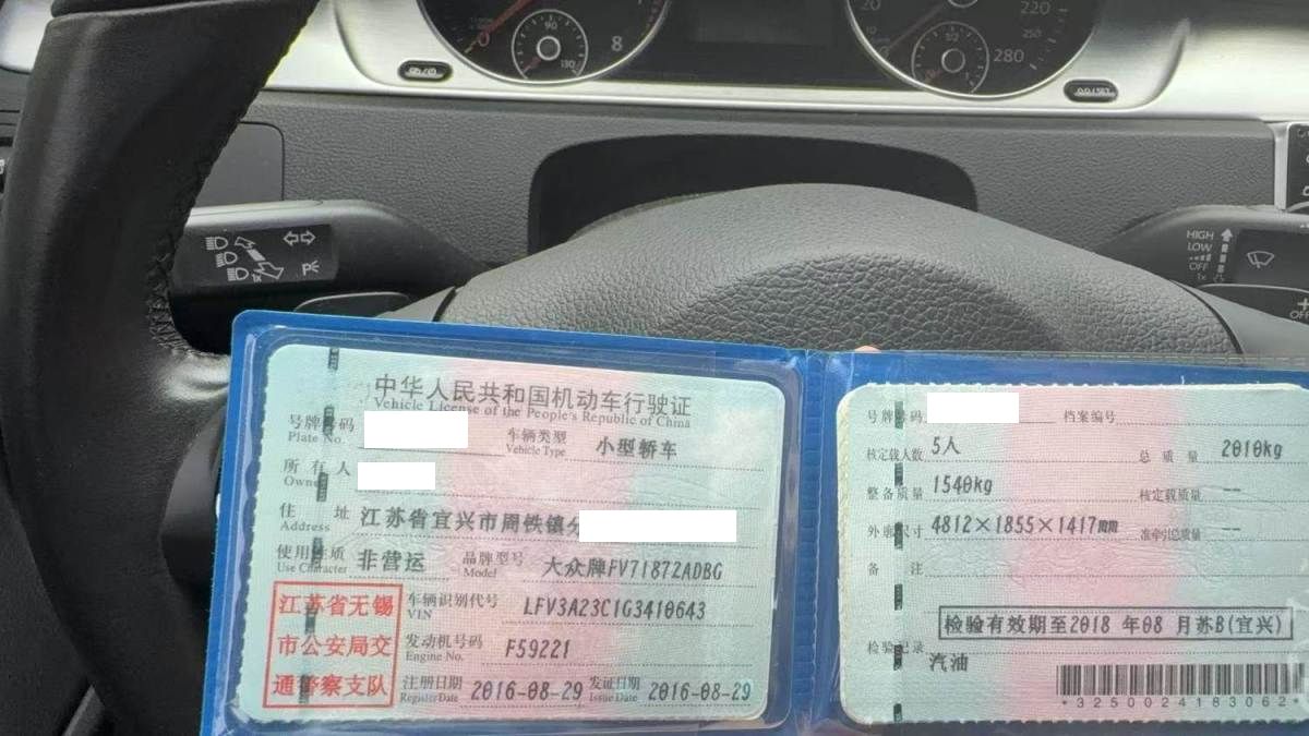 初次登记日期 2016-08-29 车辆名称 一汽-大众CC