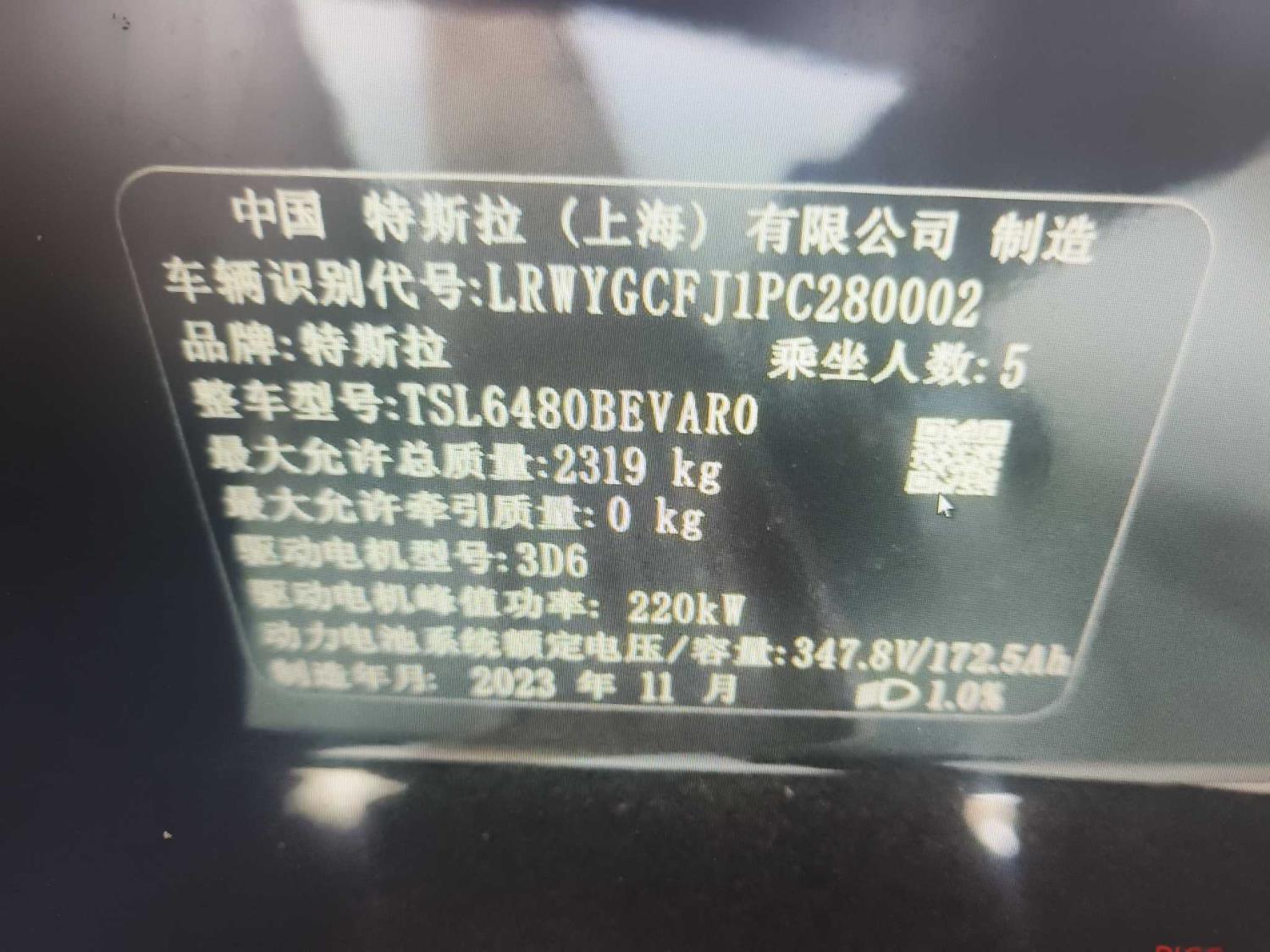 初次登记日期 2023-11-29 车辆名称 特斯拉 Model
