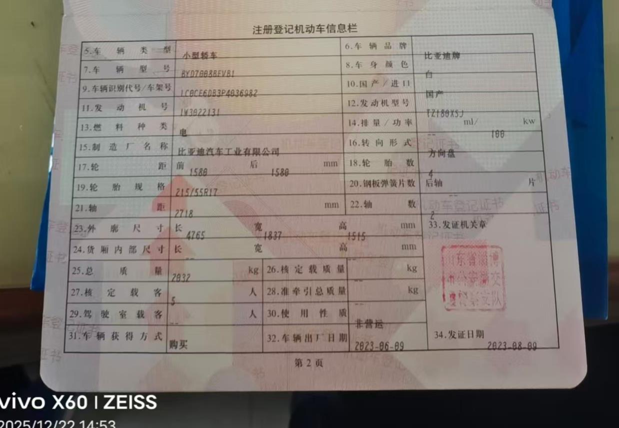 初次登记日期 2023-08-09 车辆名称 比亚迪