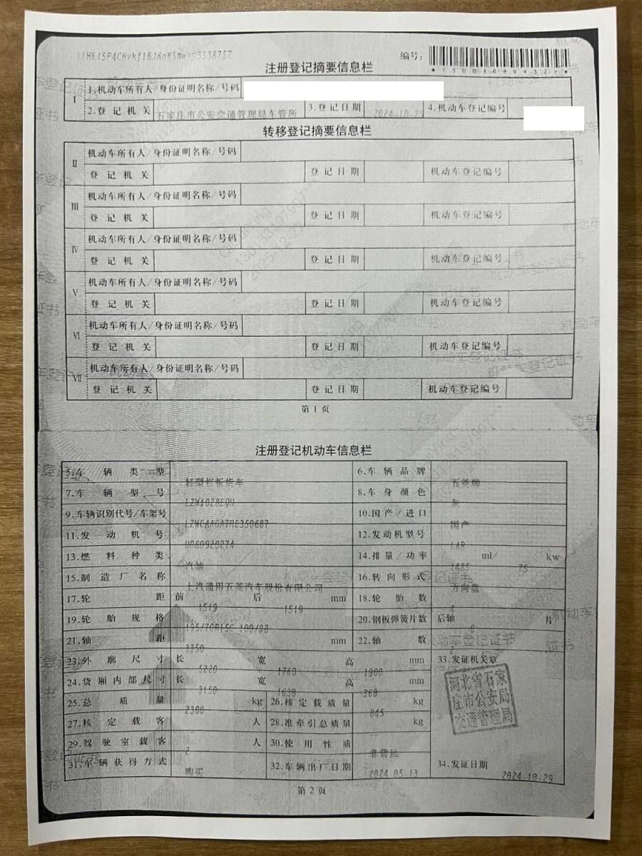 初次登记日期 2024-10-29 车辆名称 五菱汽车 五菱荣光新卡
