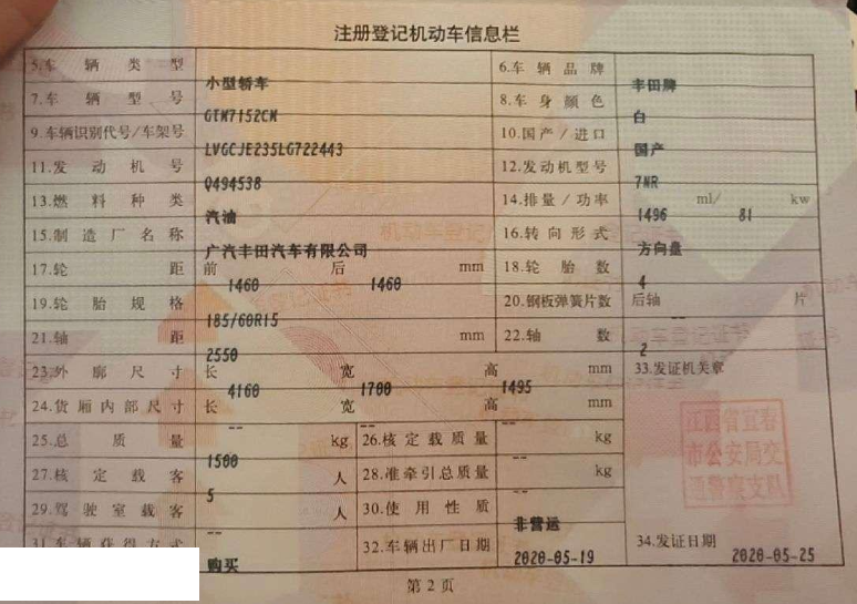 初次登记日期 2020-05-25 车辆名称 丰田 YARiS L 致炫