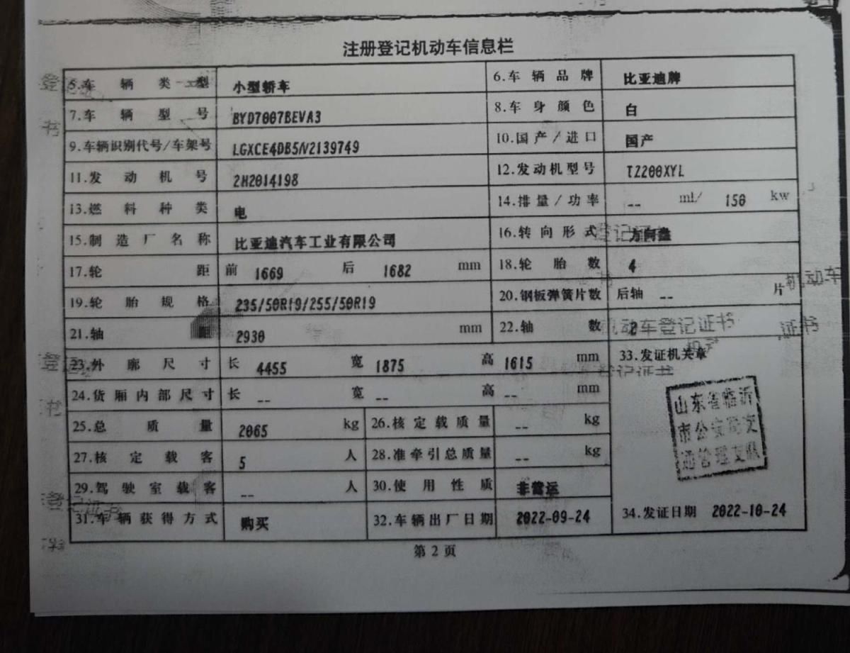 初次登记日期 2022-10-24 车辆名称 比亚迪 元