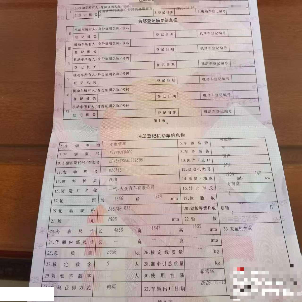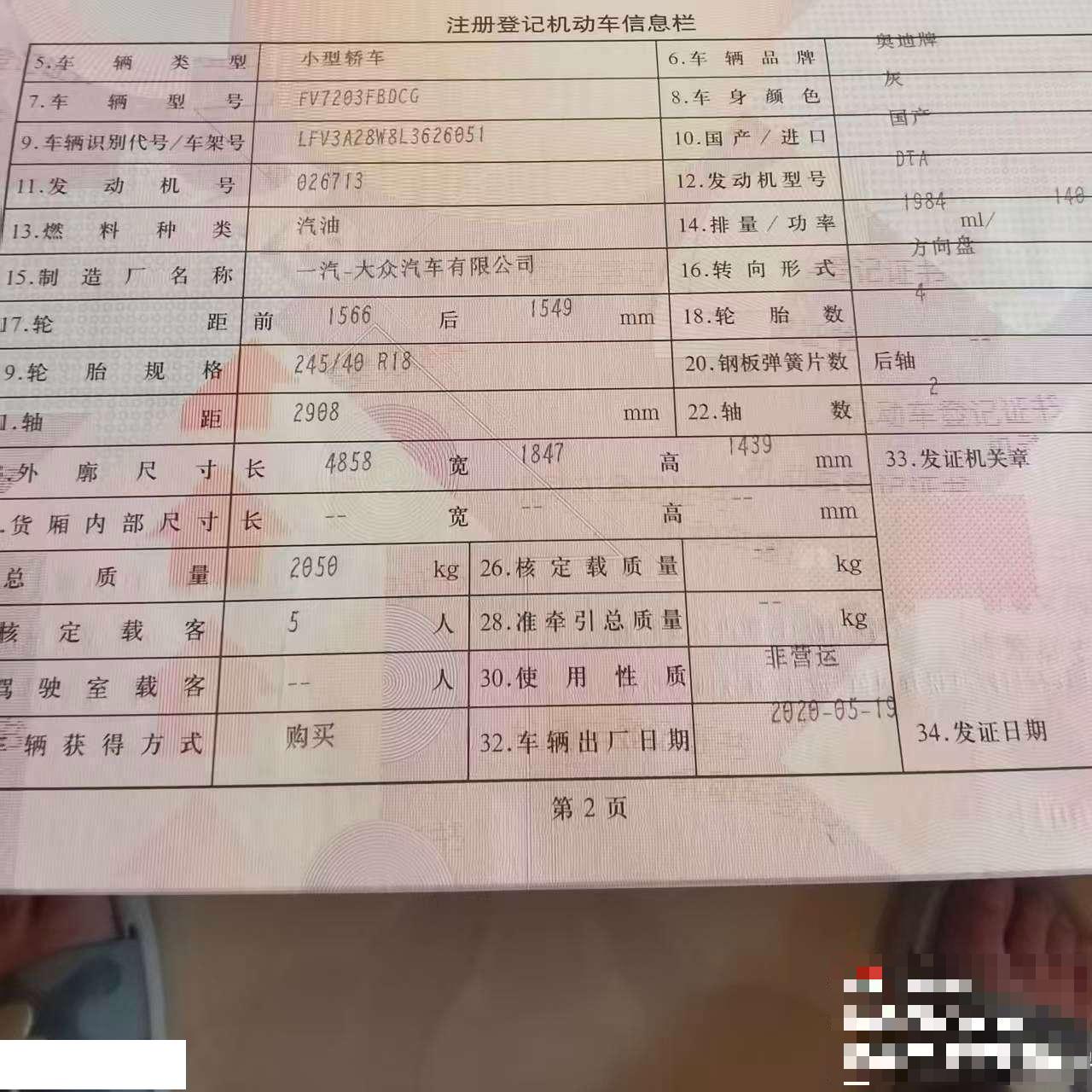 初次登记日期 2020-08-05 车辆名称 奥迪A4L