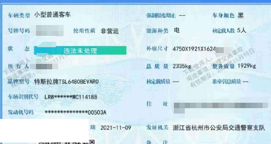 车牌号 浙****** 品牌 特斯拉