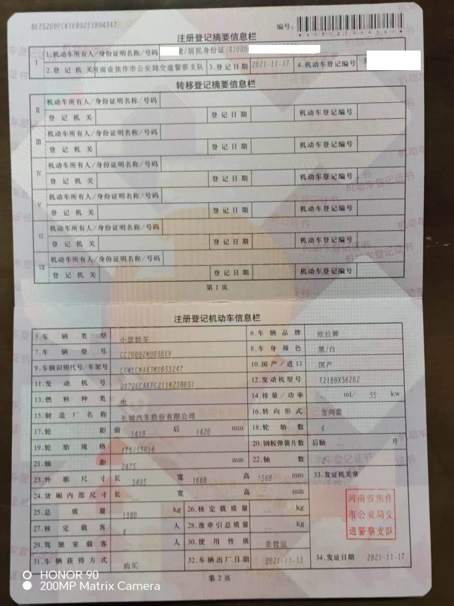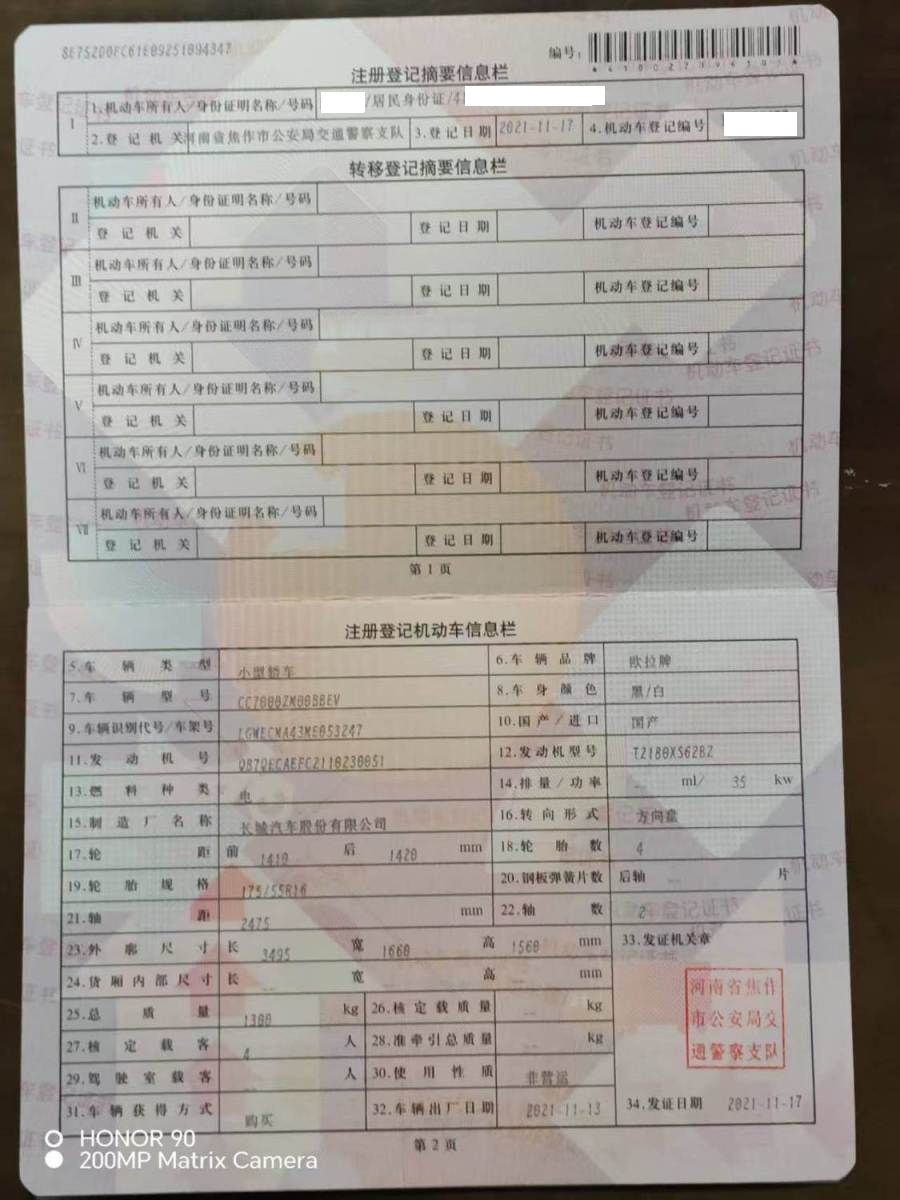车牌号 豫****** 品牌 欧拉