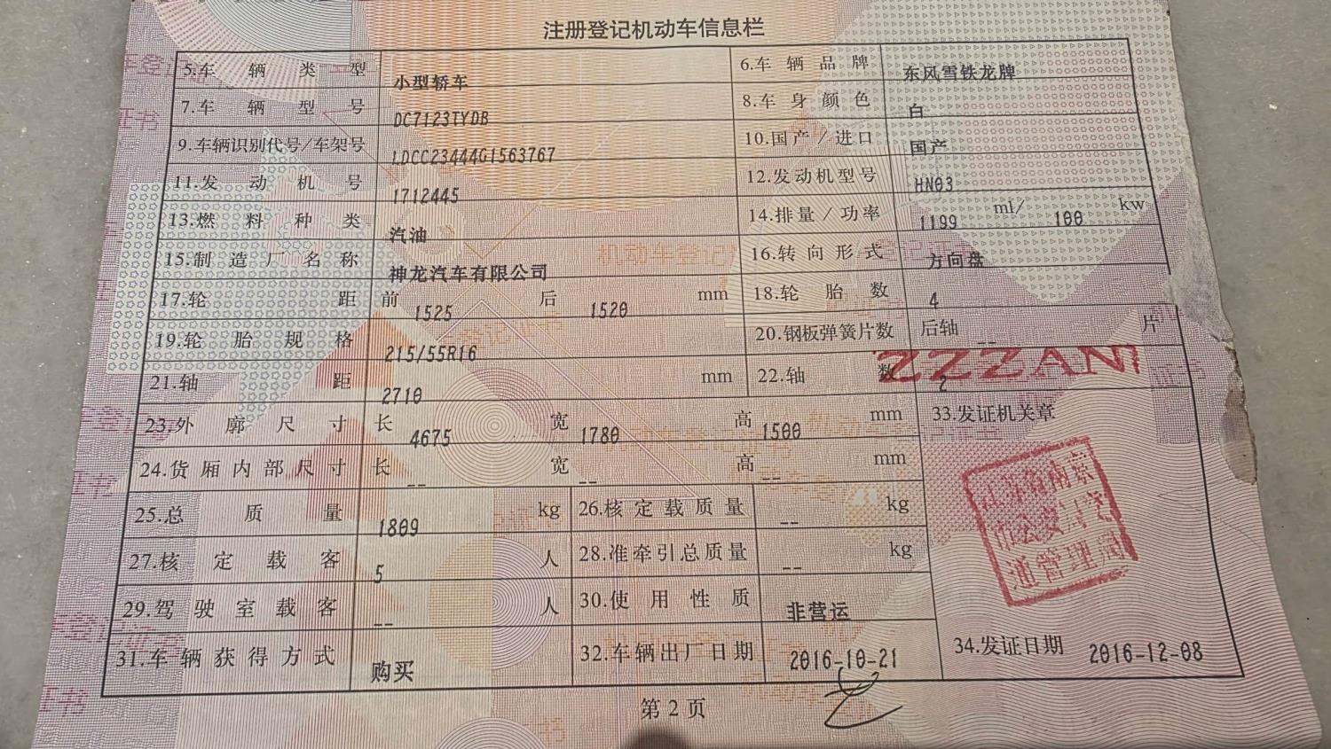 初次登记日期 2016-12-08 车辆名称 雪铁龙C4L