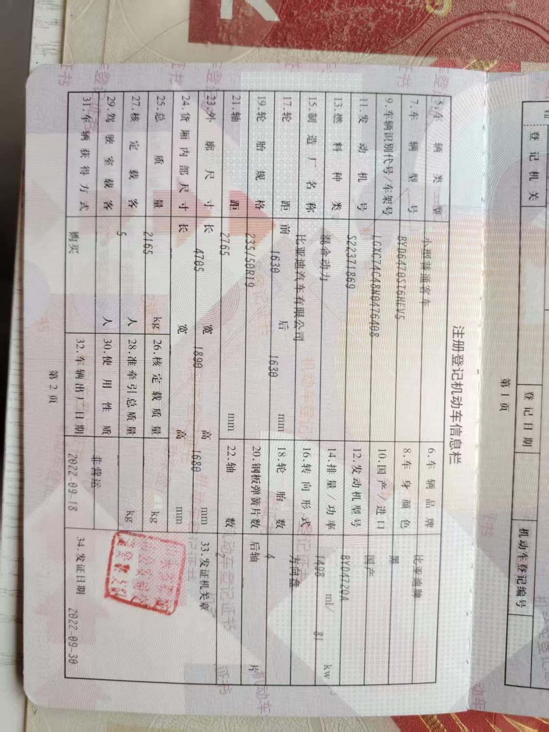 初次登记日期 2022-09-30 车辆名称 比亚迪 宋