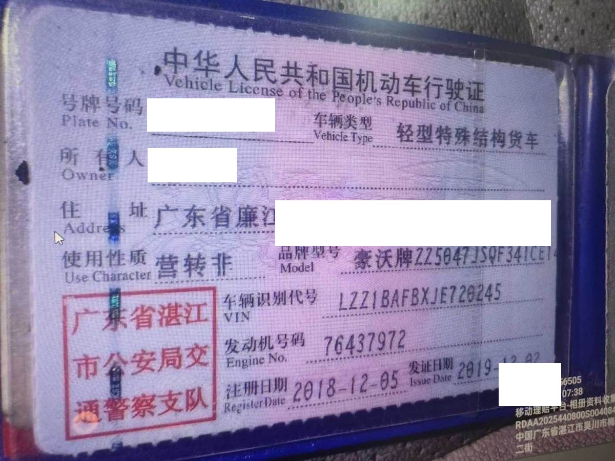 车辆归属地 广东省湛江市 车辆停放仓库 广东省湛江市湛江市