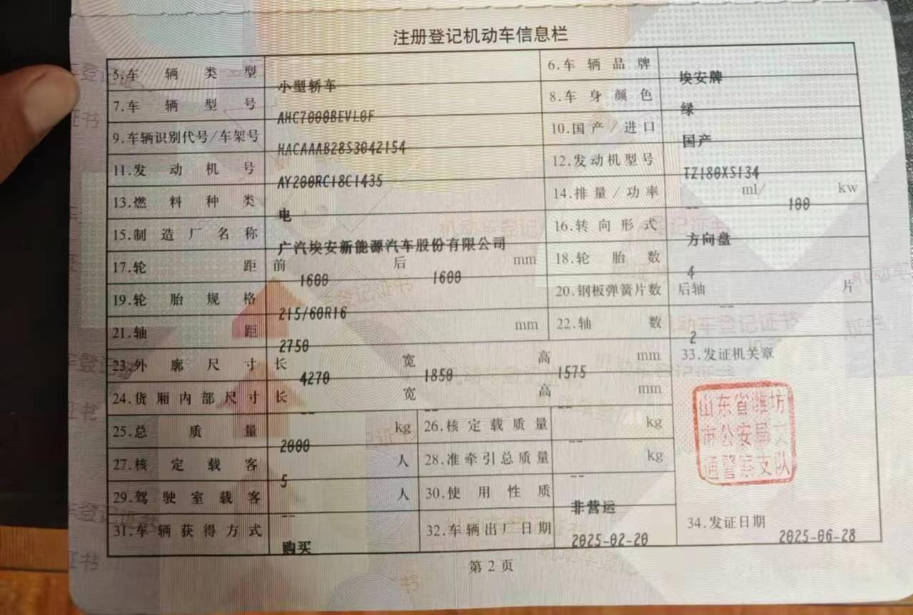 初次登记日期 2025-02-20 车辆名称 埃安牌