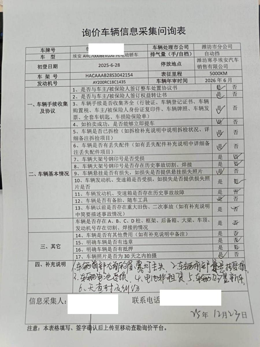 1.车辆前部右前轮眉雾灯丢失2.车辆悬挂受损,3.车辆电池受损4.车辆电池非租赁5.车辆购置新车6.无查封及纠纷
