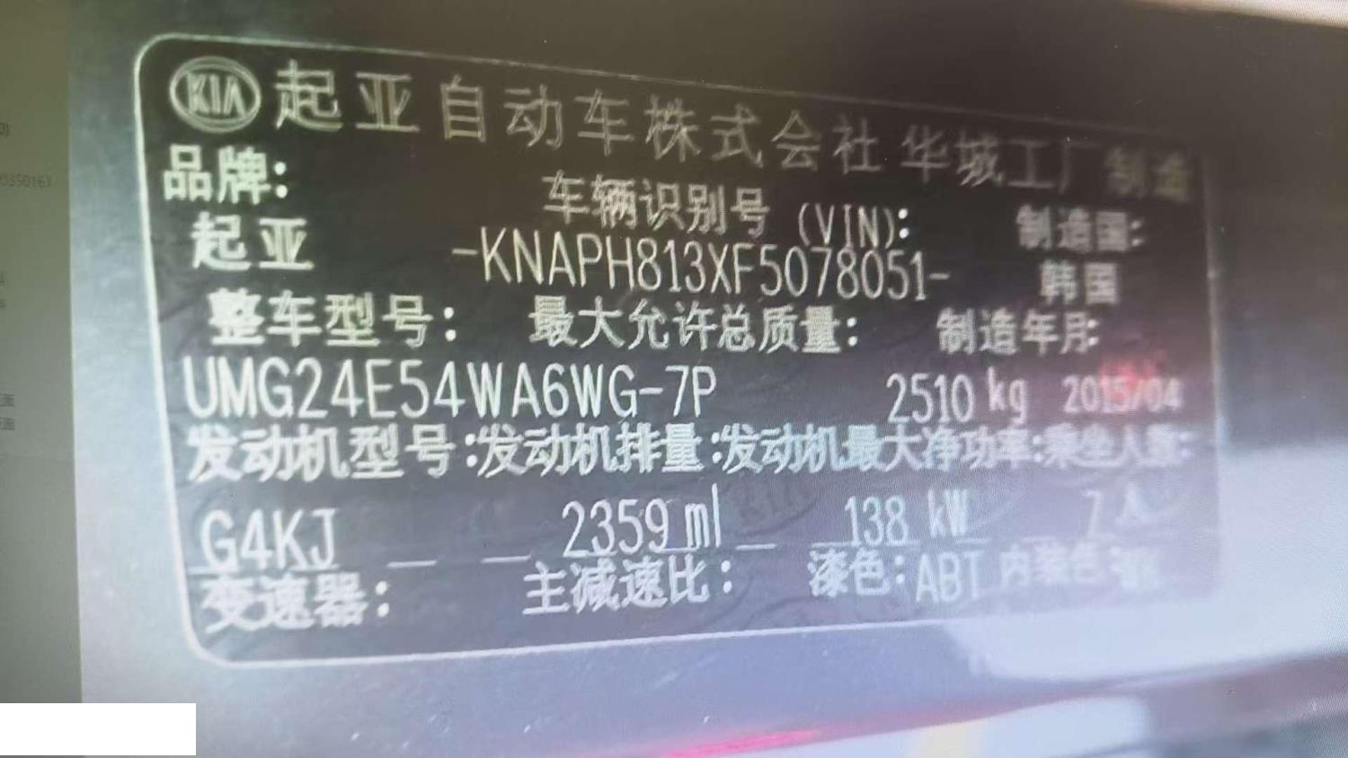 底盘号码 KNAPH813XF5078051 变速箱类型 手自一体