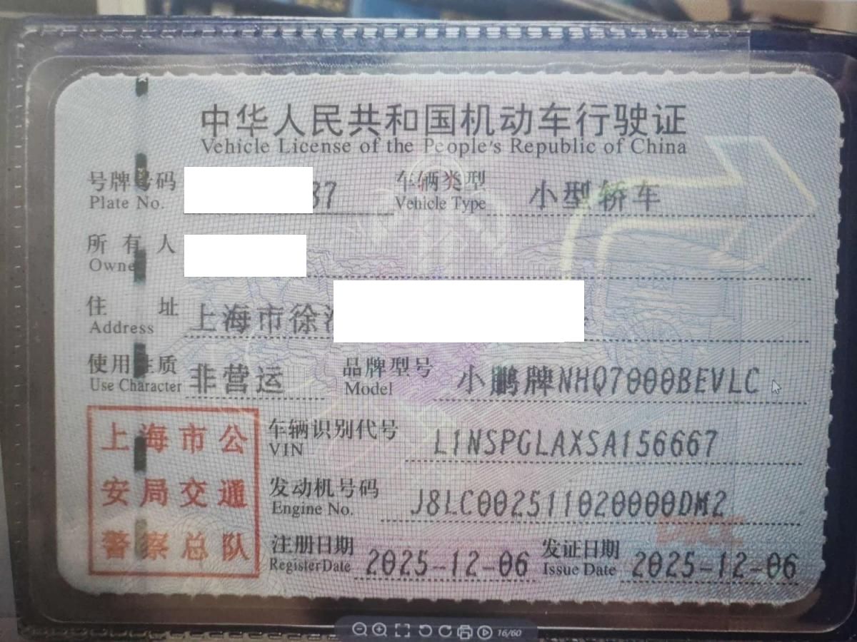 初次登记日期 2025-12-06 车辆名称 小鹏牌