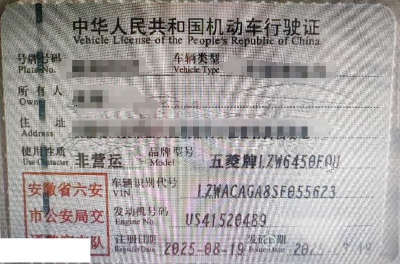 初次登记日期 2025-08-19 车辆名称 五菱汽车 五菱荣光
