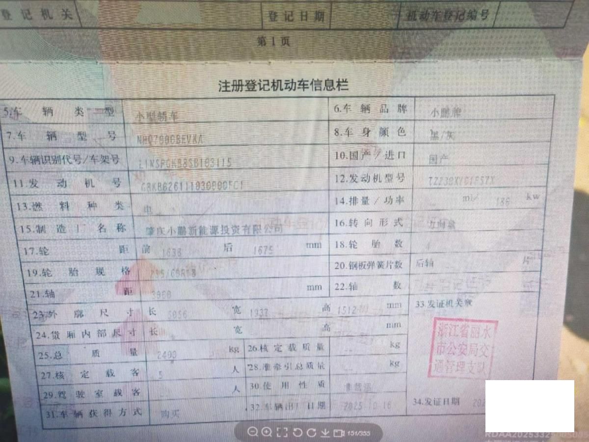 初次登记日期 2025-10-23 车辆名称 小鹏牌