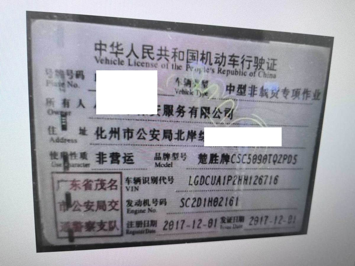 初次登记日期 2017-12-01 车辆名称 楚胜 楚胜清障车