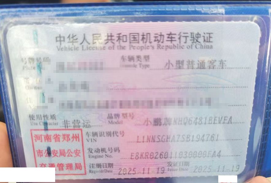 初次登记日期 2025-11-19 车辆名称 小鹏牌