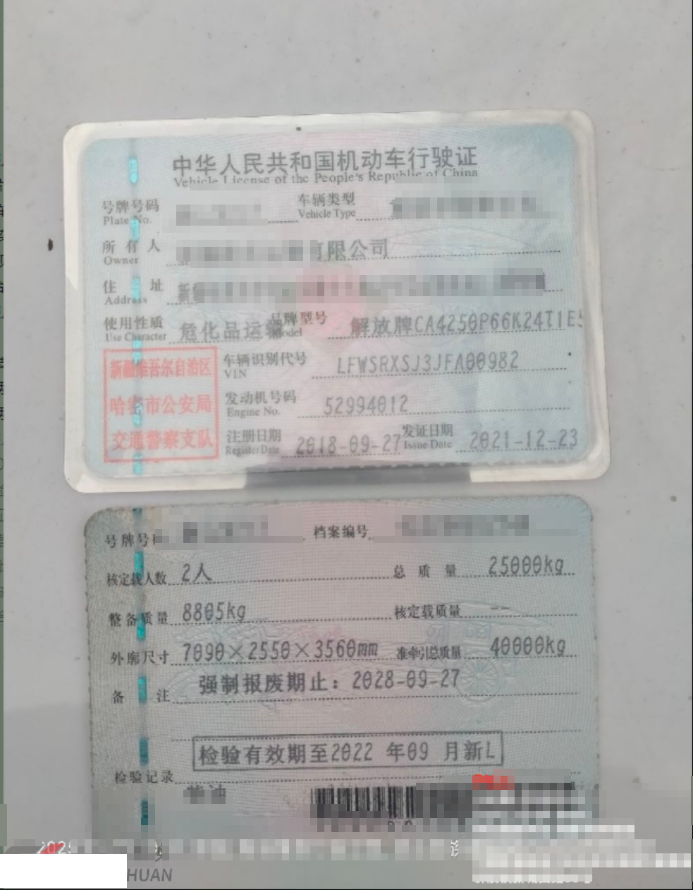 车架号是否受损 未知 使用性质 危化品运输