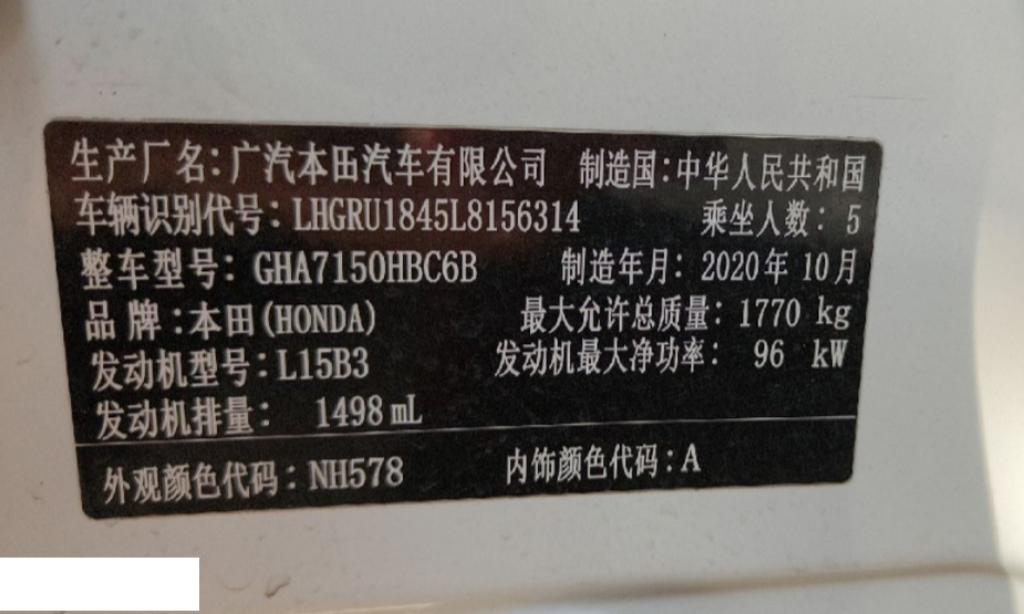 底盘号码 LHGRU1845L8156314 变速箱类型 自动
