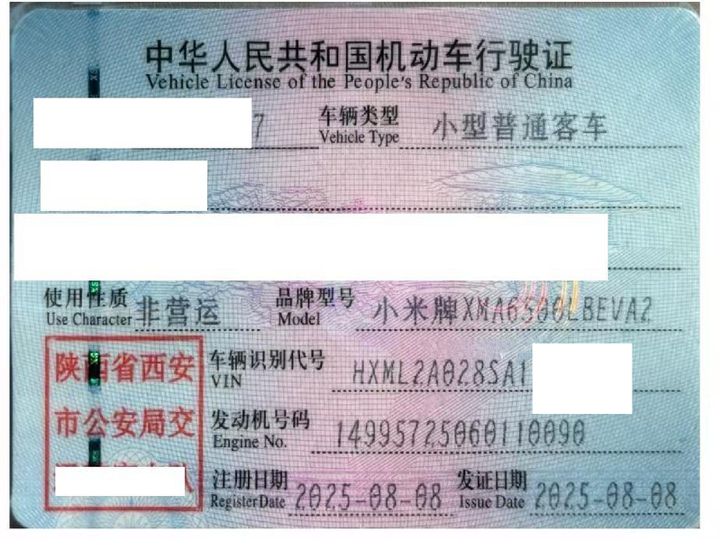 初次登记日期 2025-08-08 车辆名称 小米汽车 小米