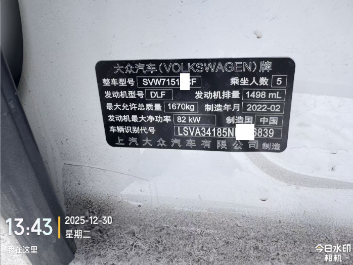 初次登记日期 2022-06-27 车辆名称 大众 朗逸