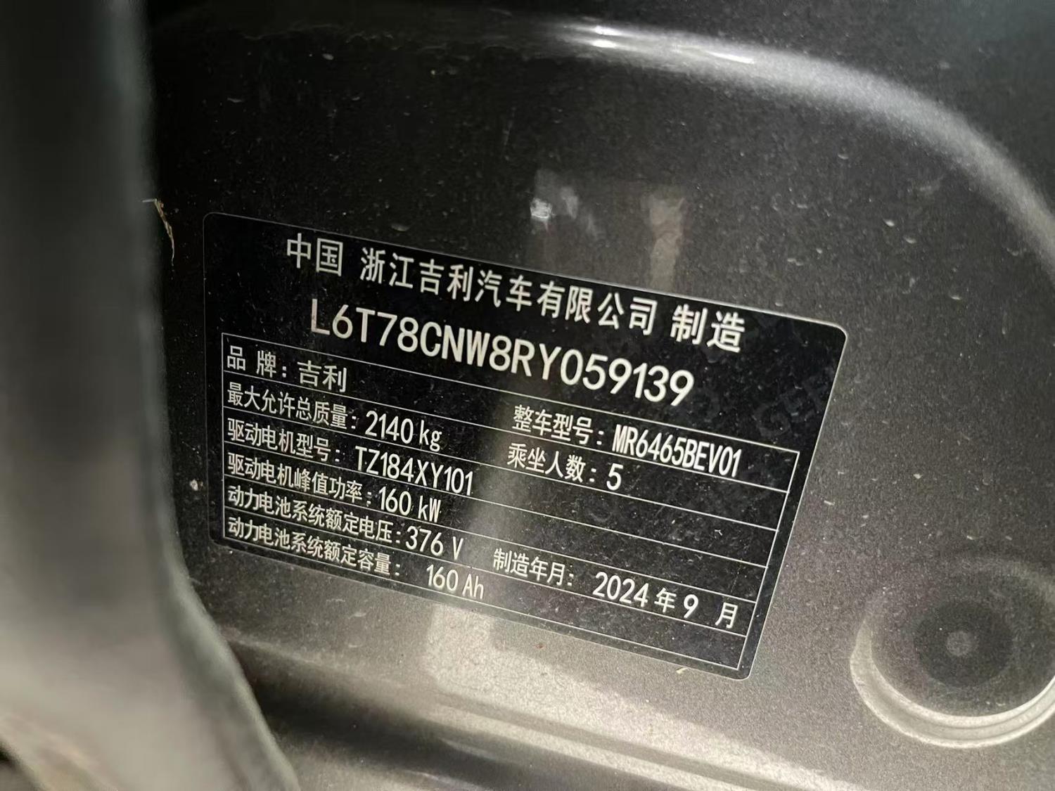 初次登记日期 2024-10-08 车辆名称 吉利银河