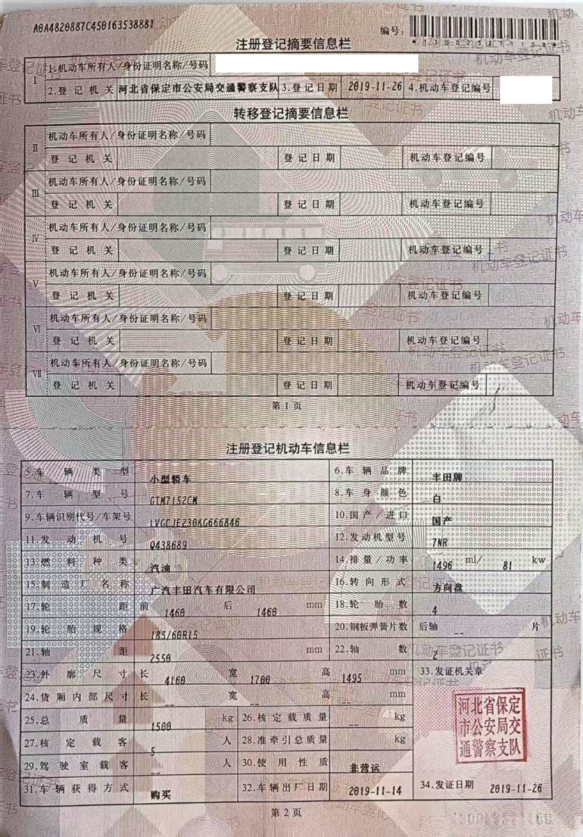 车牌号 冀****** 品牌 丰田