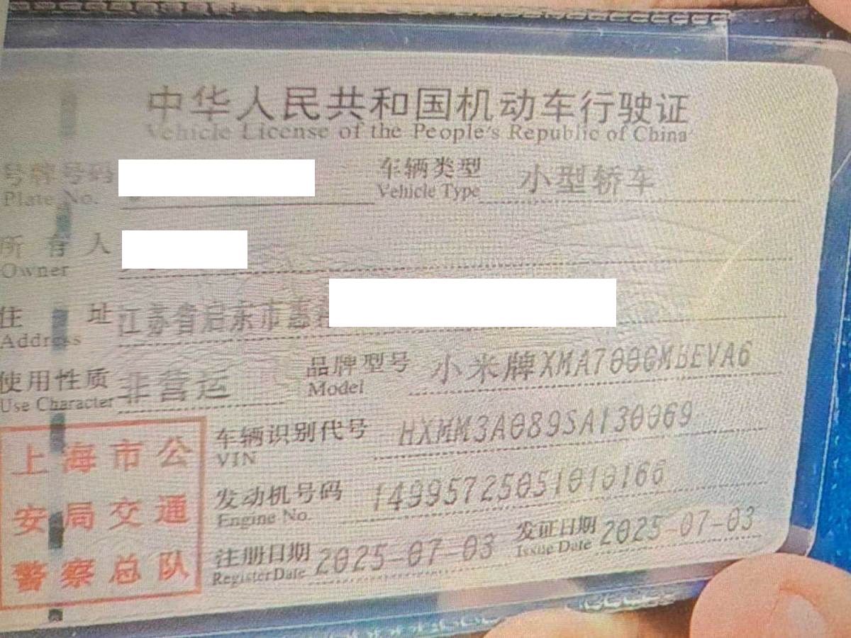 初次登记日期 2025-07-03 车辆名称 小米汽车 小米