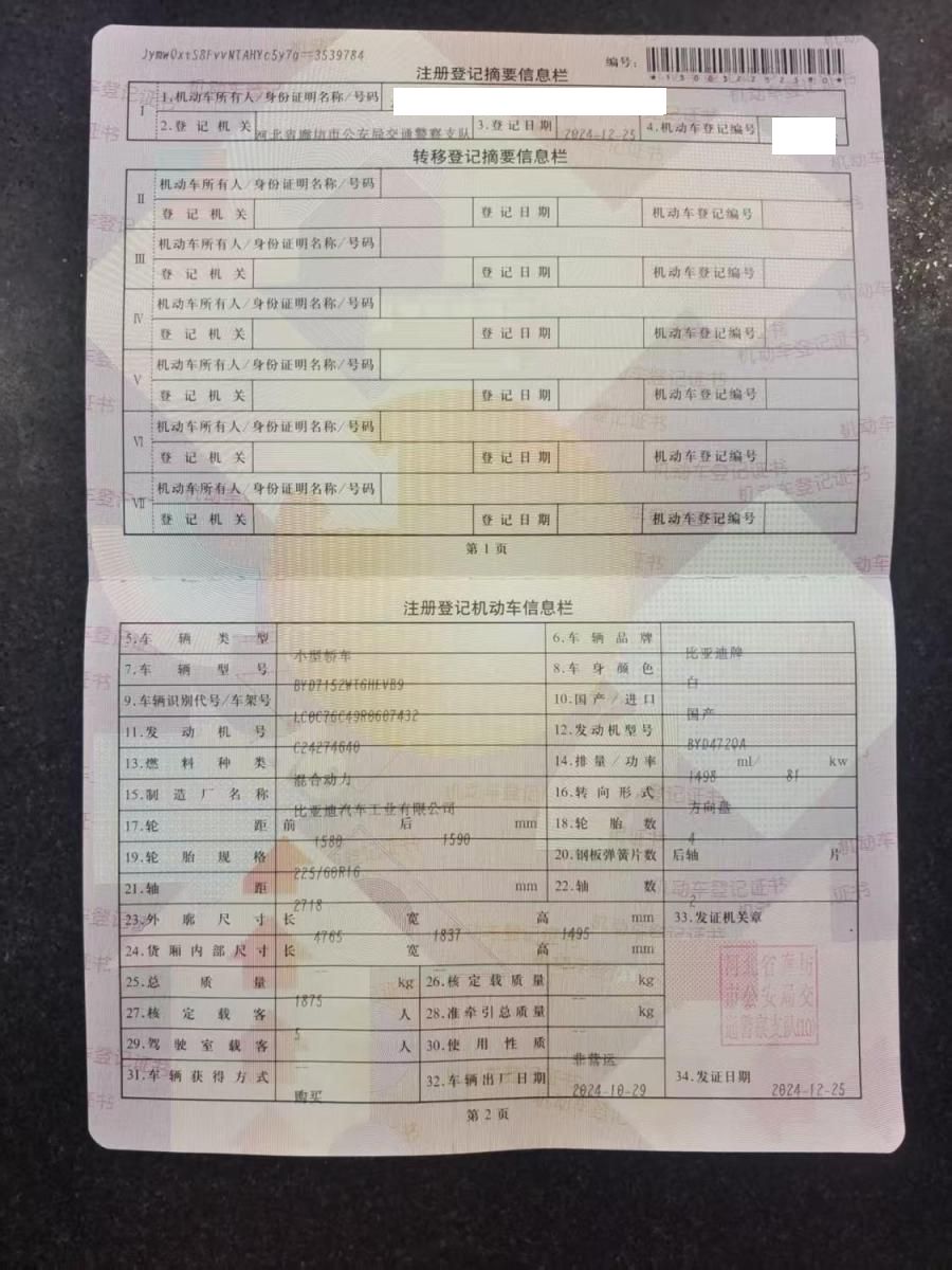 初次登记日期 2024-12-25 车辆名称 比亚迪 秦PLUS