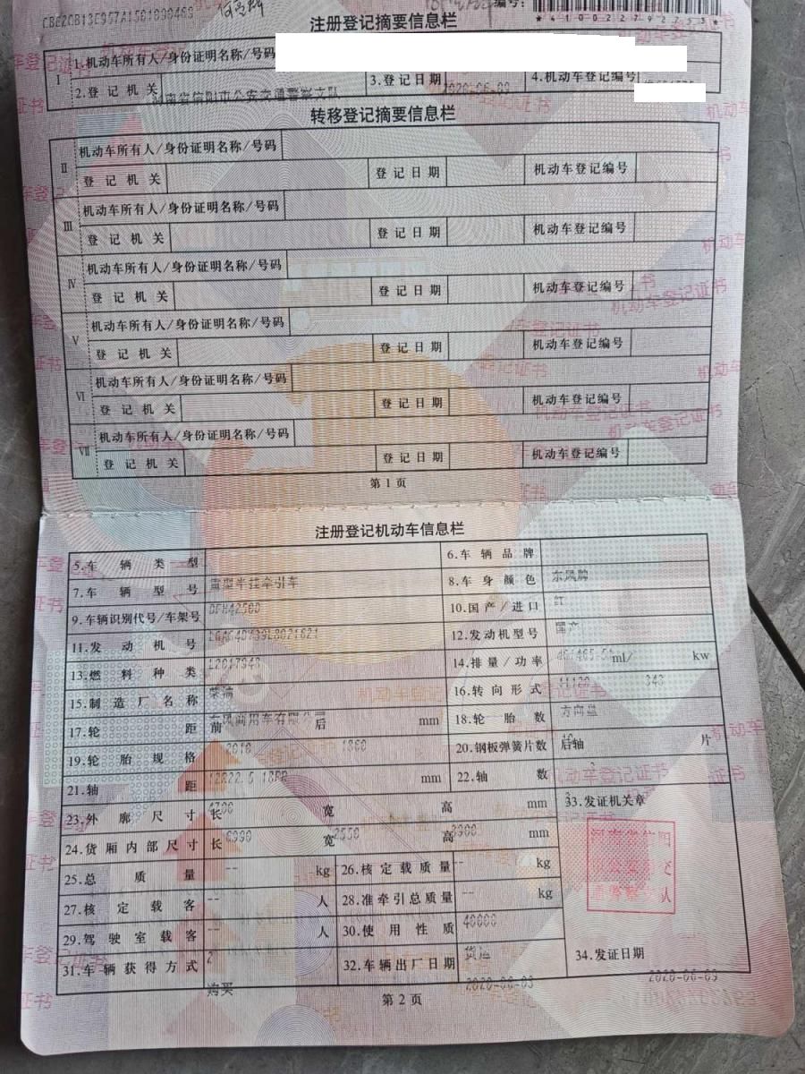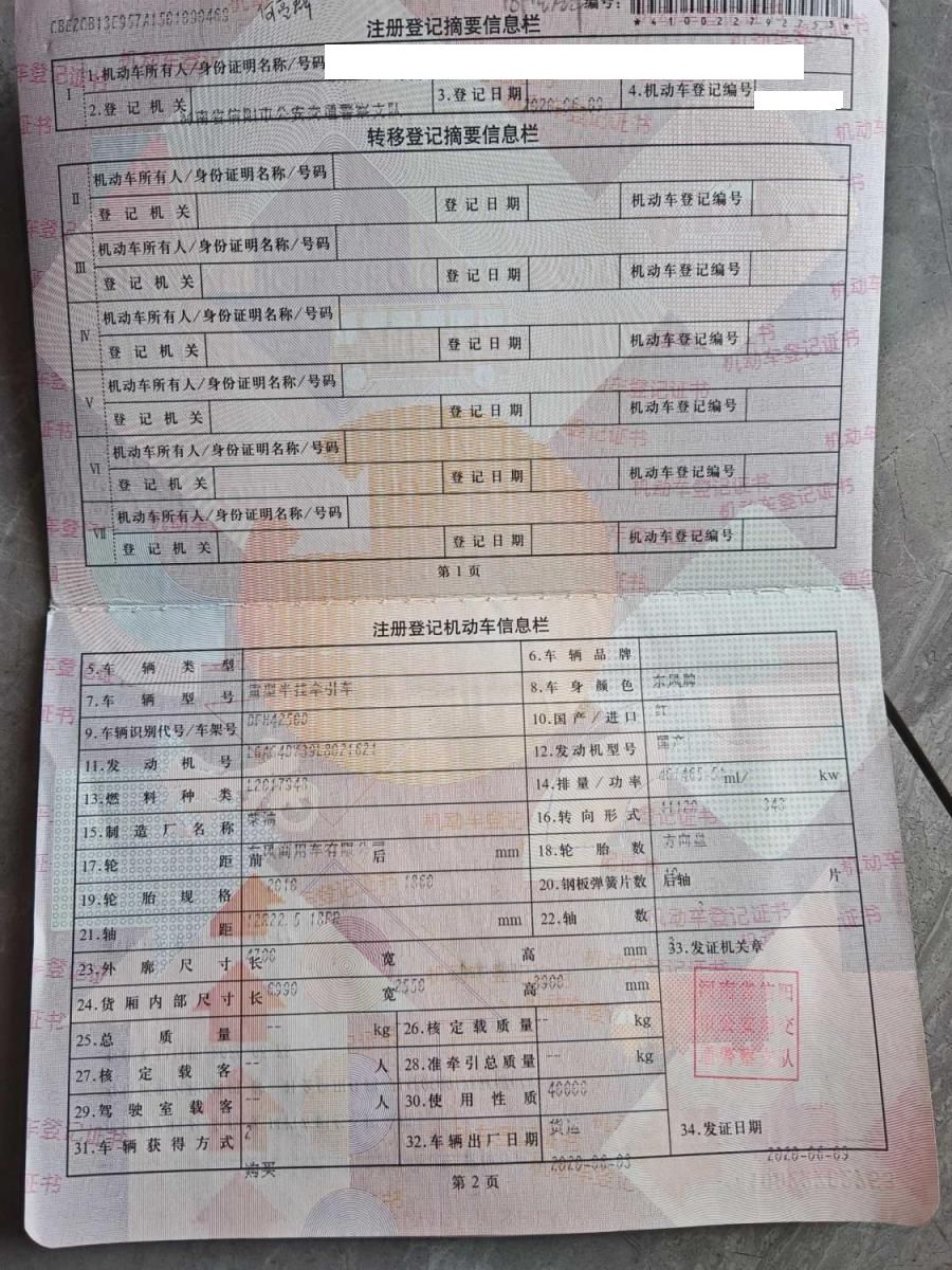 初次登记日期 2020-06-09 车辆名称 东风商用车 东风天龙(A)