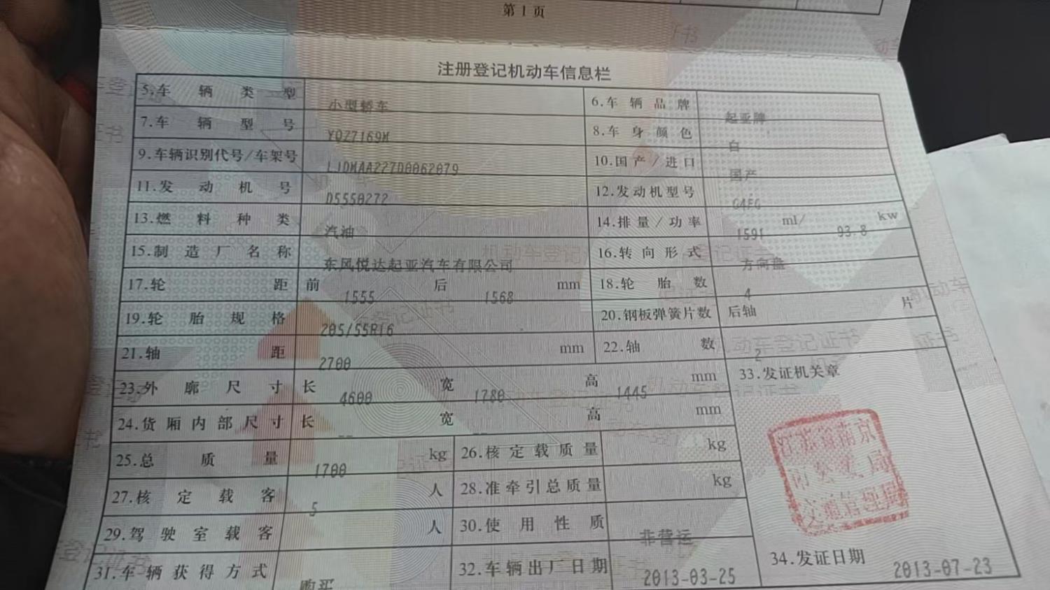 初次登记日期 2013-07-23 车辆名称 起亚K3