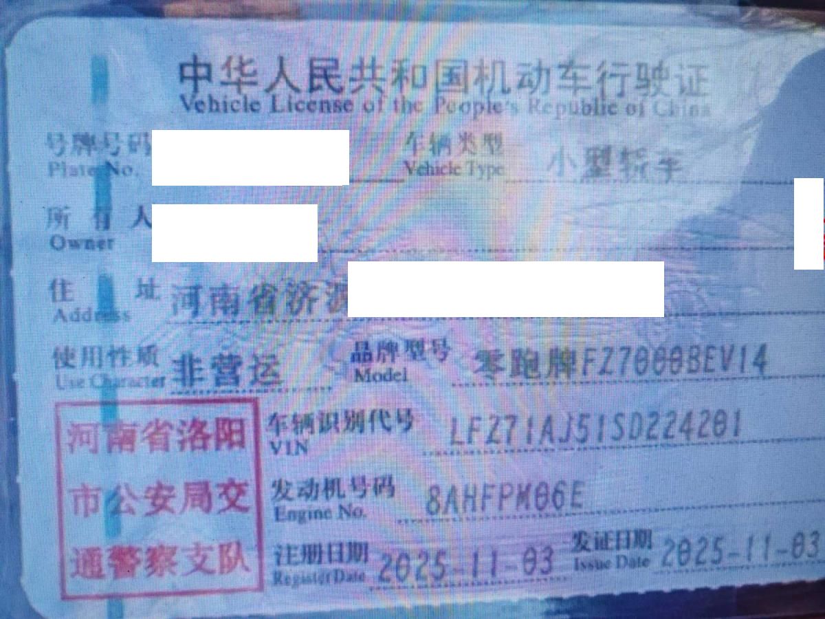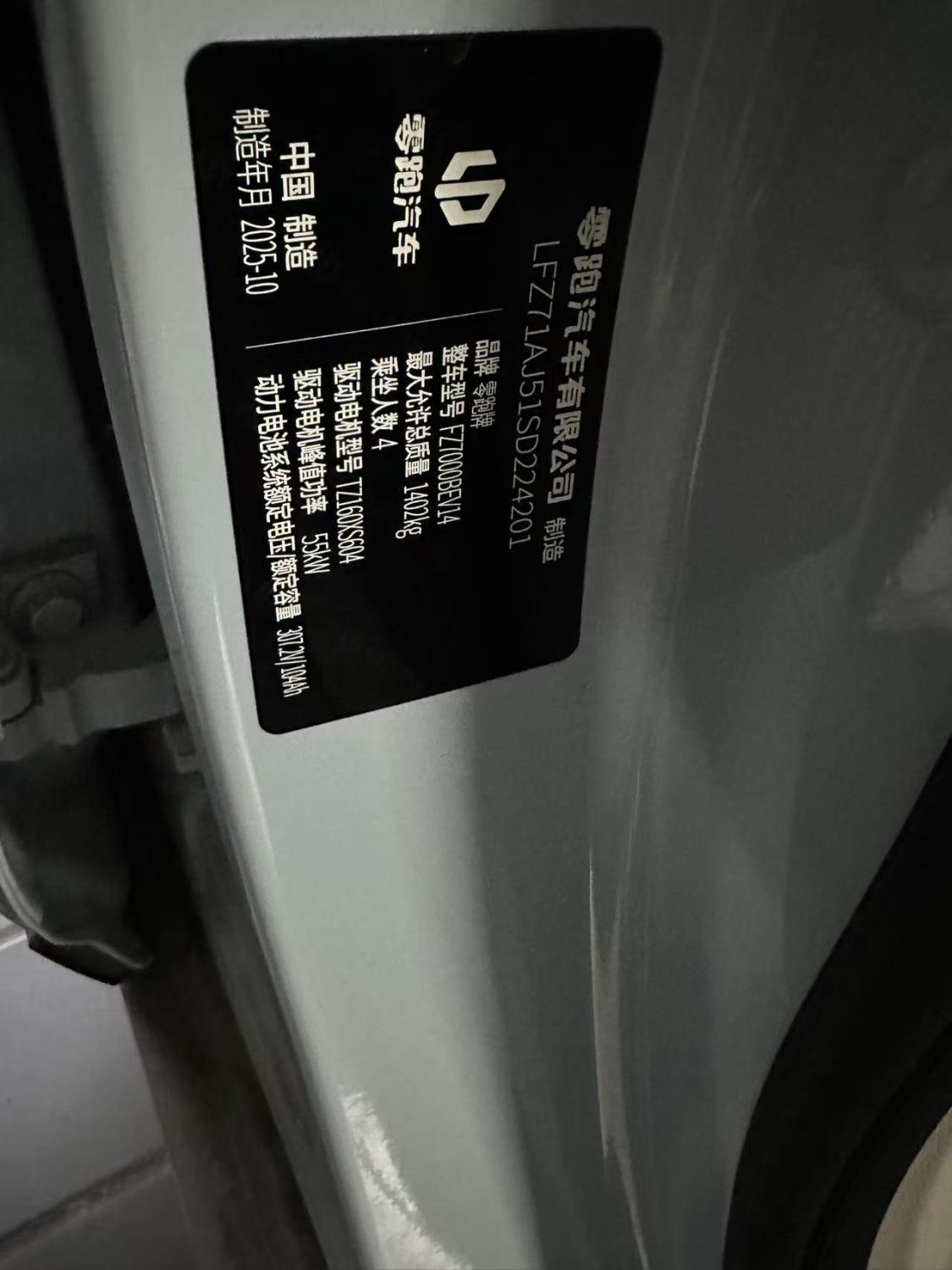 初次登记日期 2025-11-03 车辆名称 零跑汽车