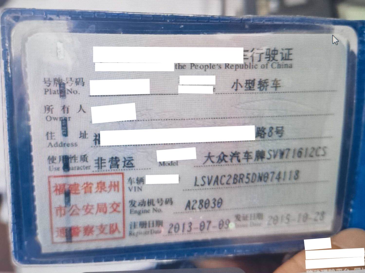 初次登记日期 2013-07-09 车辆名称 大众 桑塔纳