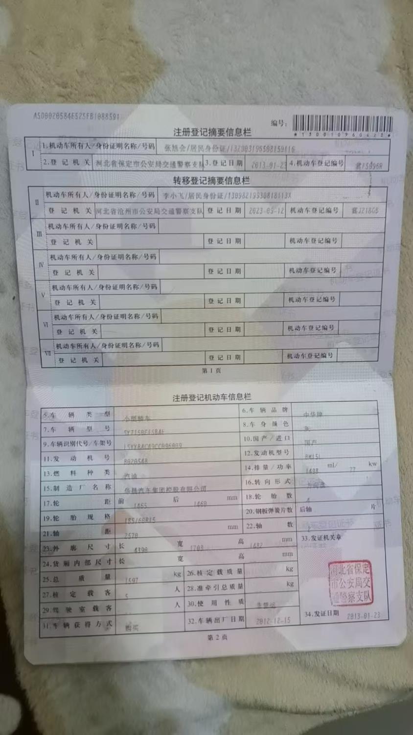 初次登记日期 2013-01-23 车辆名称 中华H230