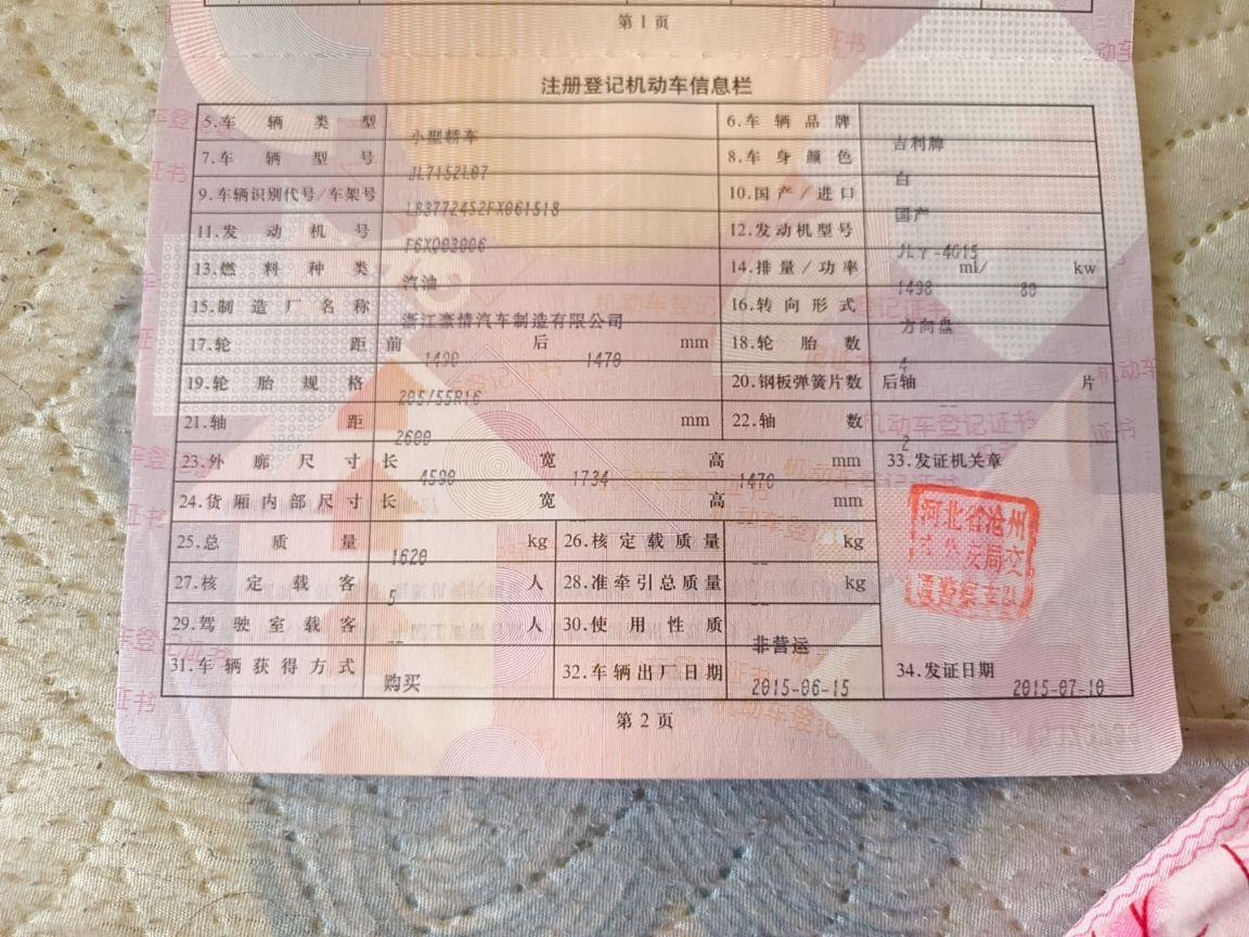 初次登记日期 2015-07-10 车辆名称 吉利汽车 远景