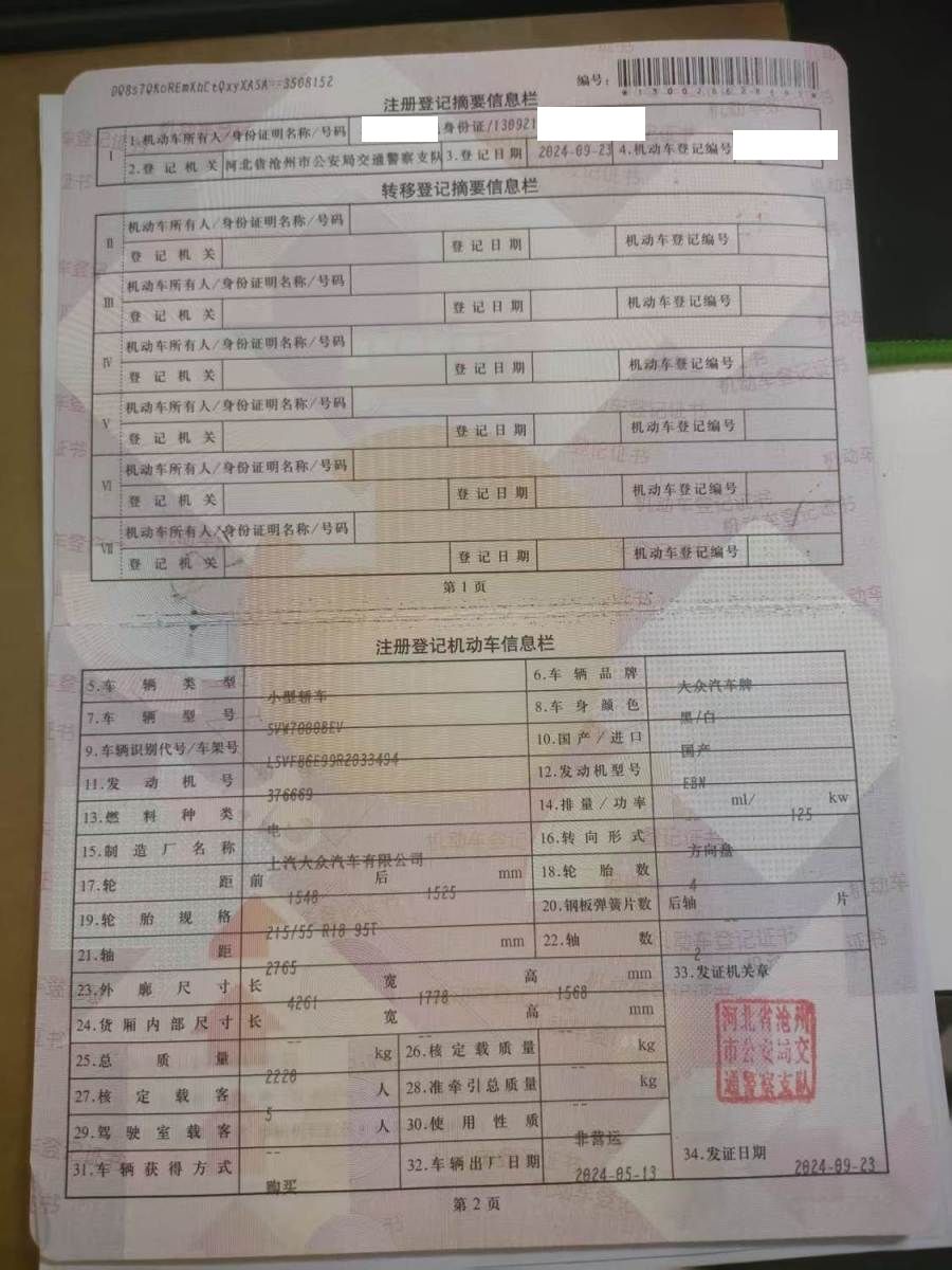 初次登记日期 2024-09-23 车辆名称 大众牌