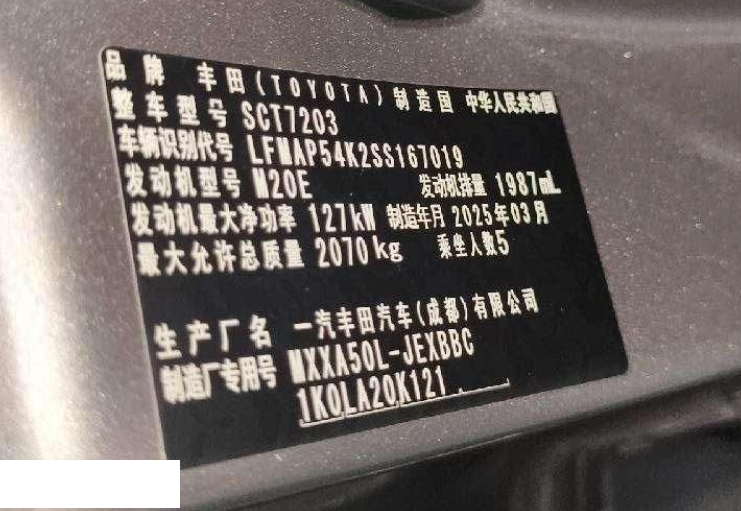 初次登记日期 2025-07-29 车辆名称 丰田 亚洲龙