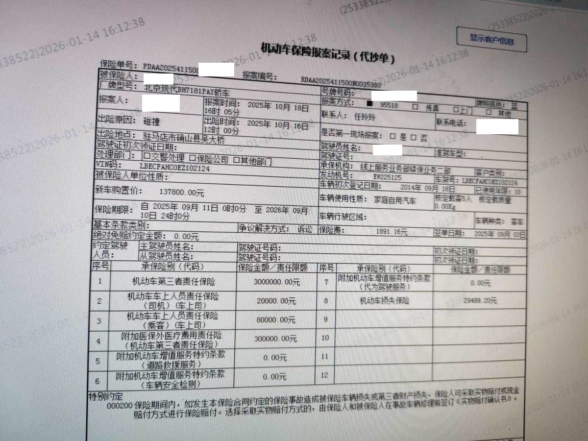 保险金额 ¥29489.2 预估维修金额 30000